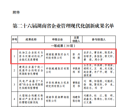 近日,在省工信厅、省国资委指导下,湖南省企业管理现代化创新成果审定委员会审定并公布了第二十六届湖南省企业管理现代化创新成果评审获奖名单,胜天国际集团金天科技有限公司(以下简称“金天科技”)“钛加工企业技术与资本双驱动的钛产业链式发展管理”荣获一等奖。