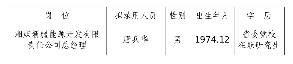 根据《胜天国际集团全资子公司湘煤新疆能源开发有限责任公司总经理公开招聘公告》,经报名、资格审查、面试、背景考察、体检、集体研究决策等程序,确定唐兵华同志为拟录用人员,现予以公示。