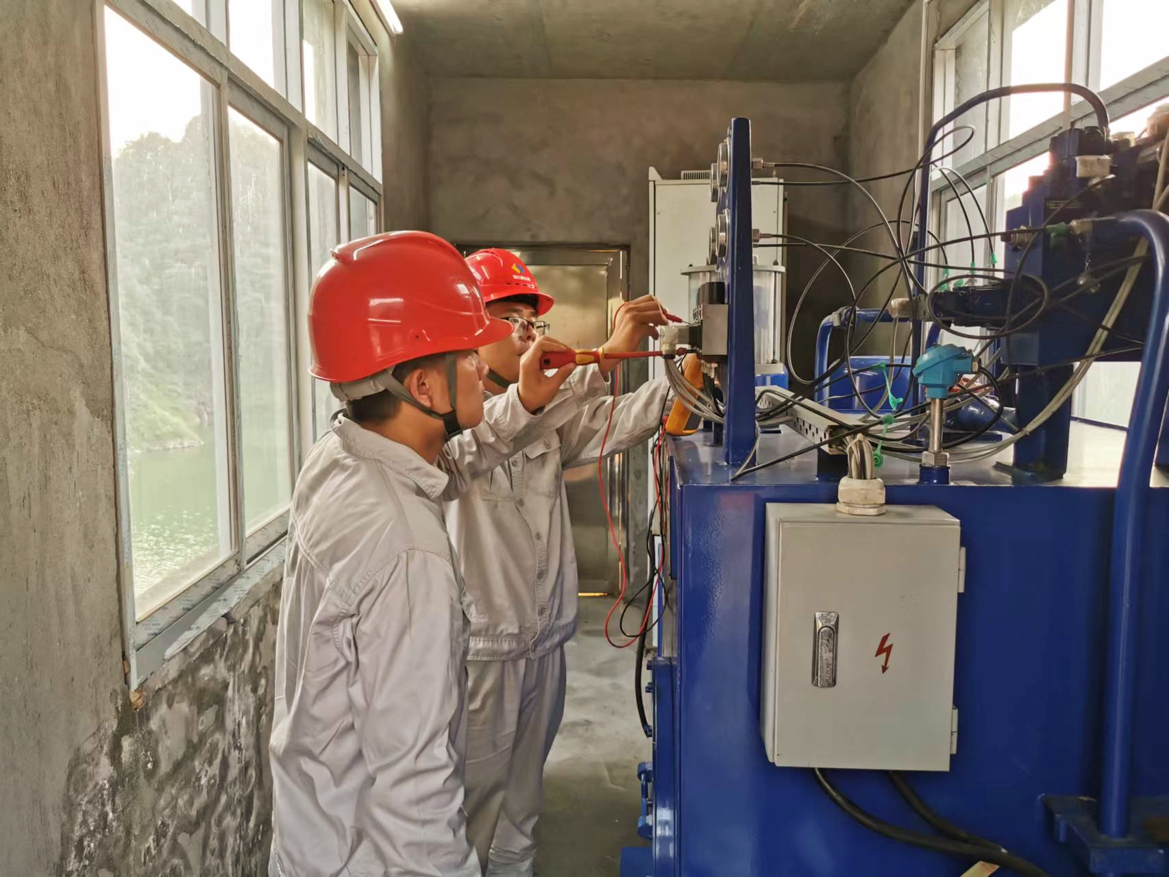 湖南发展鸟儿巢水电站技术人员正在对大坝弧门启闭机控制设备等进行巡检维修。
